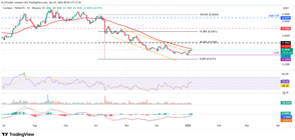 Cardano (ADA) đang duy trì trạng thái đi ngang vững chắc quanh mốc 0,40 USD tại thời điểm ghi nhận vào ngày thứ Hai, sau khi giá có cú đóng cửa thuyết phục phía trên mô hình kênh song song giảm dần trong tuần trước. Diễn biến trên thị trường phái sinh phản ánh sự cải thiện rõ rệt về tâm lý, khi lượng hợp đồng mở (OI) của ADA gia tăng, cùng với đó là sự mở rộng của các vị thế mua trong cộng đồng trader.