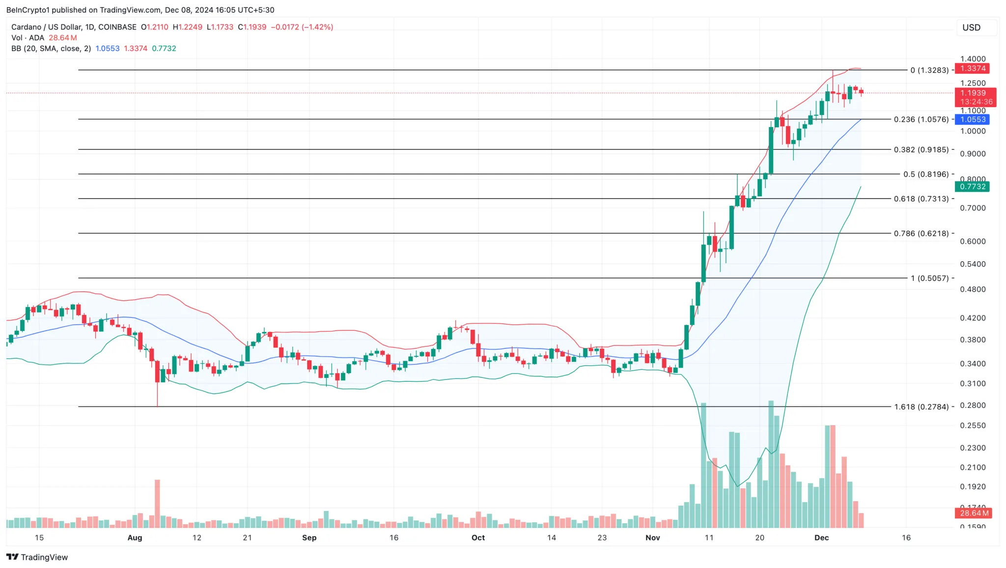 Biểu đồ hàng ngày cho thấy Bollinger Band (BB) của ADA đã mở rộng đáng kể, phản ánh sự biến động cao.