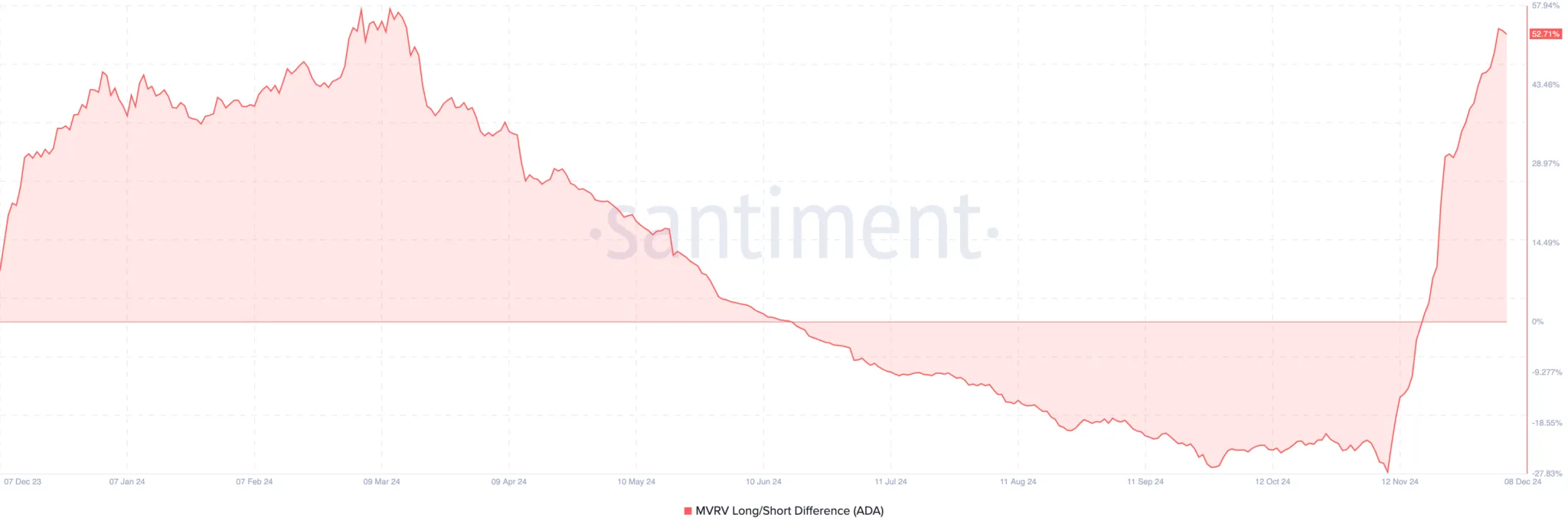 Một chỉ báo quan trọng cho thấy ADA có thể đang tiến gần đến trạng thái định giá quá cao là MVRV Long/Short Difference. Chỉ số này đo lường sự chênh lệch lợi nhuận giữa các nhà đầu tư dài hạn và ngắn hạn, mang đến góc nhìn sâu sắc về trạng thái thị trường: