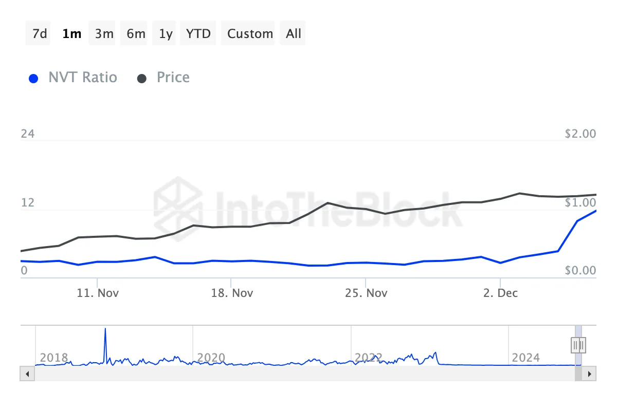 Dữ liệu từ IntoTheBlock cho thấy tỷ lệ NVT (Giá trị mạng lưới trên giao dịch) của ADA cũng đang tăng mạnh.