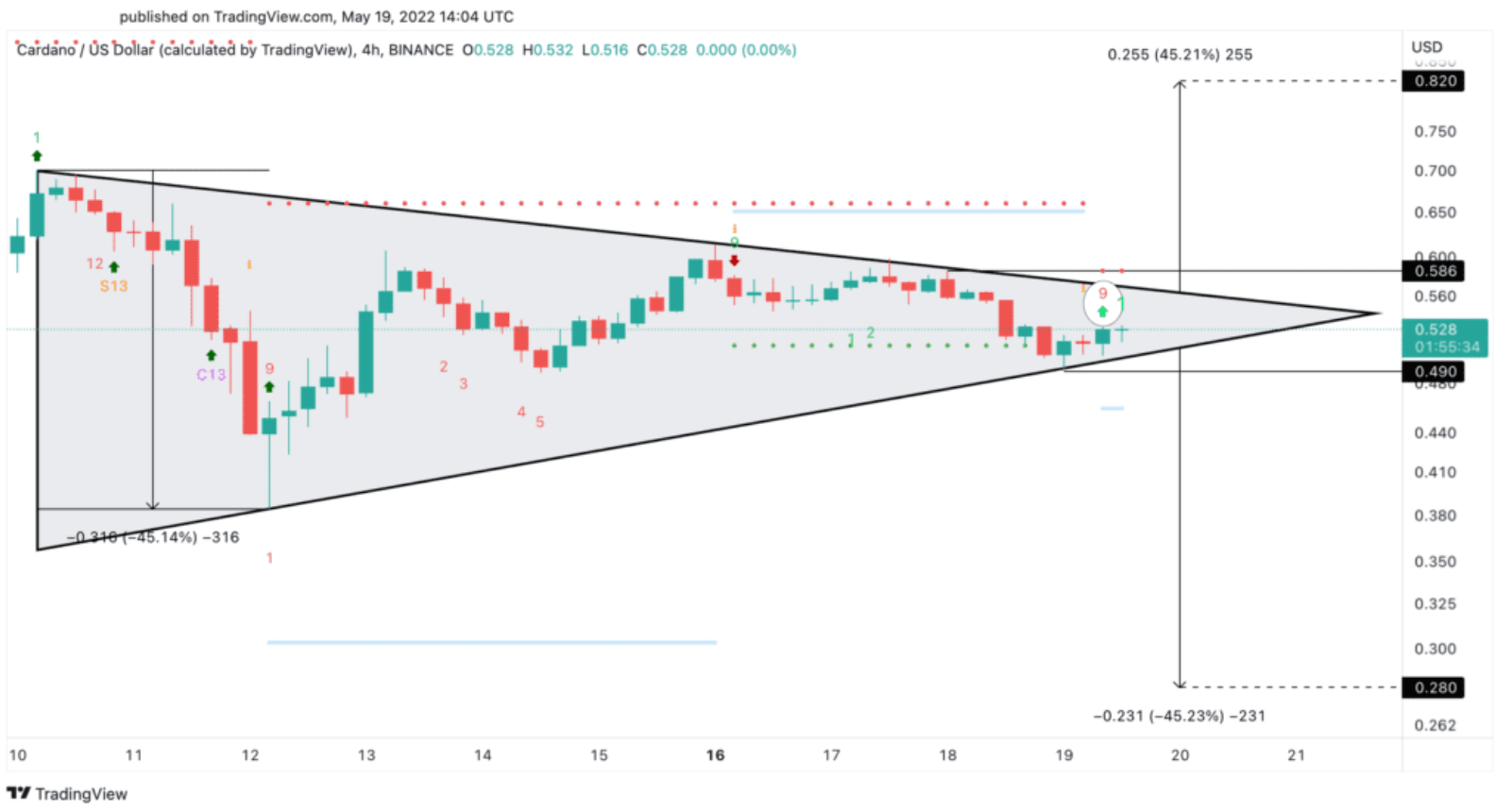 Nó đã phải chịu đựng sự điều chỉnh 45% sau vòng xoáy tử thần của Terra, chứng kiến giá giảm từ mức cao $ 0,70 xuống mức thấp nhất là $ 0,38 vào ngày 12 tháng 5. Kể từ đó, ADA đã được củng cố trong một phạm vi giá chặt chẽ, đang trở nên hẹp hơn theo thời gian.