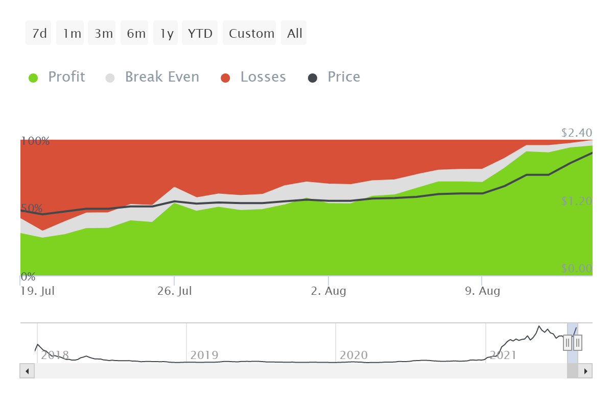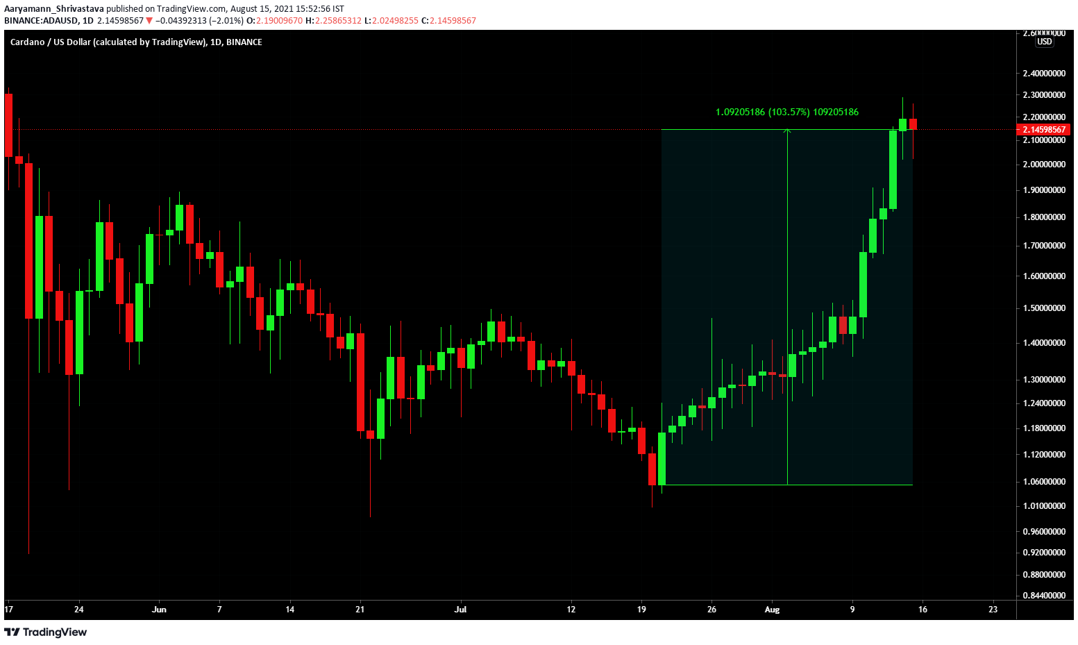 Dữ liệu tiết lộ rằng trong vòng chưa đầy một tháng, ADA tăng tới 103%, từ 1 đô la vào ngày 21/7 lên đến 2,15 đô la vào thời điểm viết bài.