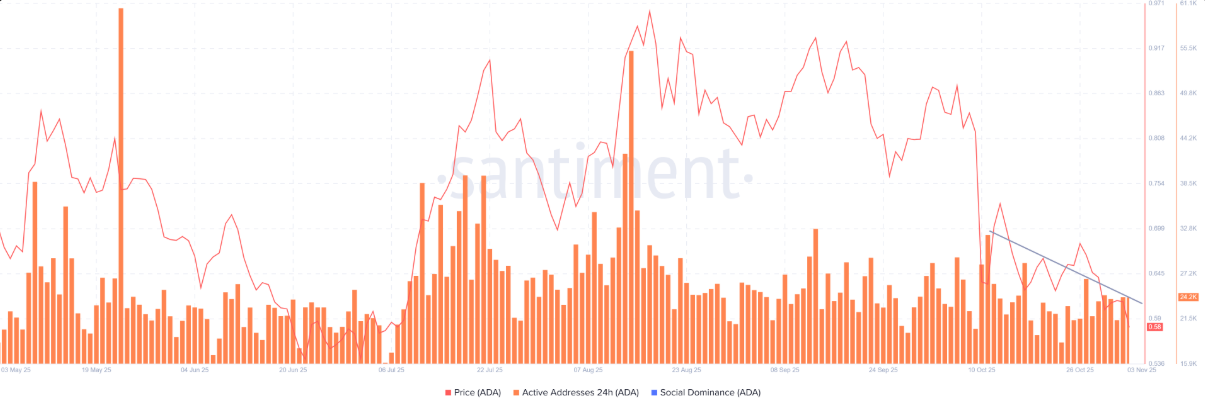 Với Cardano (ADA), số lượng địa chỉ hoạt động hàng ngày đã giảm từ 32.115 (ngày 11/10) xuống còn 24.280 (ngày 3/11), duy trì xu hướng giảm liên tục từ tháng 8 đến nay. Diễn biến này cho thấy nhu cầu sử dụng blockchain Cardano đang suy yếu rõ rệt, có thể làm gia tăng áp lực bán và kéo giá ADA xuống thấp hơn nữa.