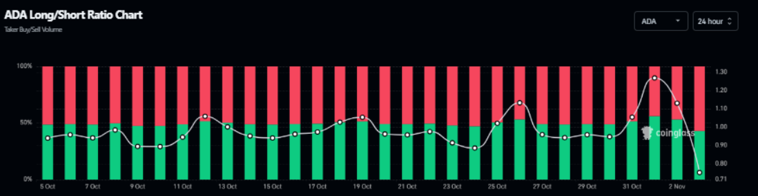 Ở mảng phái sinh, dữ liệu từ CoinGlass ghi nhận tỷ lệ long/short của ADA chỉ còn 0,75 vào ngày thứ Hai – mức thấp nhất trong vòng một tháng. Khi tỷ lệ này nằm dưới ngưỡng 1, điều đó phản ánh tâm lý bi quan của thị trường, với phần lớn trader đang đặt cược vào khả năng ADA tiếp tục giảm giá.