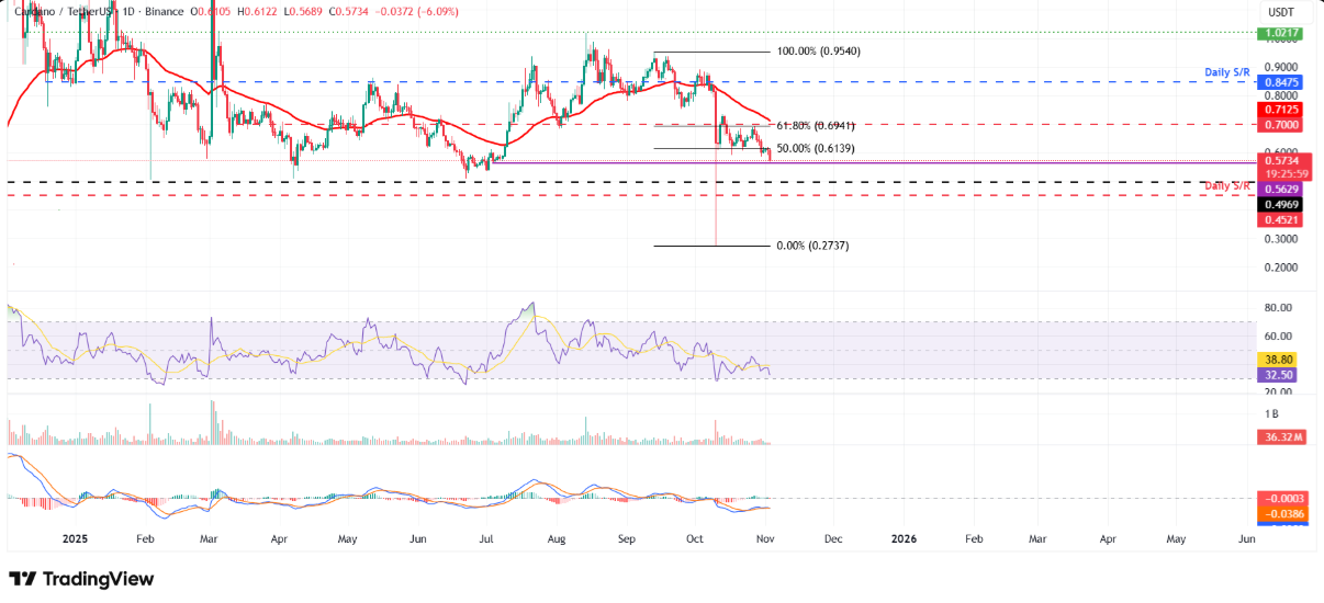 Tuần trước, giá ADA bị từ chối mạnh tại vùng kháng cự 0,70 USD và đã lao dốc hơn 10%. Tính đến thời điểm viết bài vào ngày thứ Hai, ADA đang dao động quanh mức 0,57 USD.
