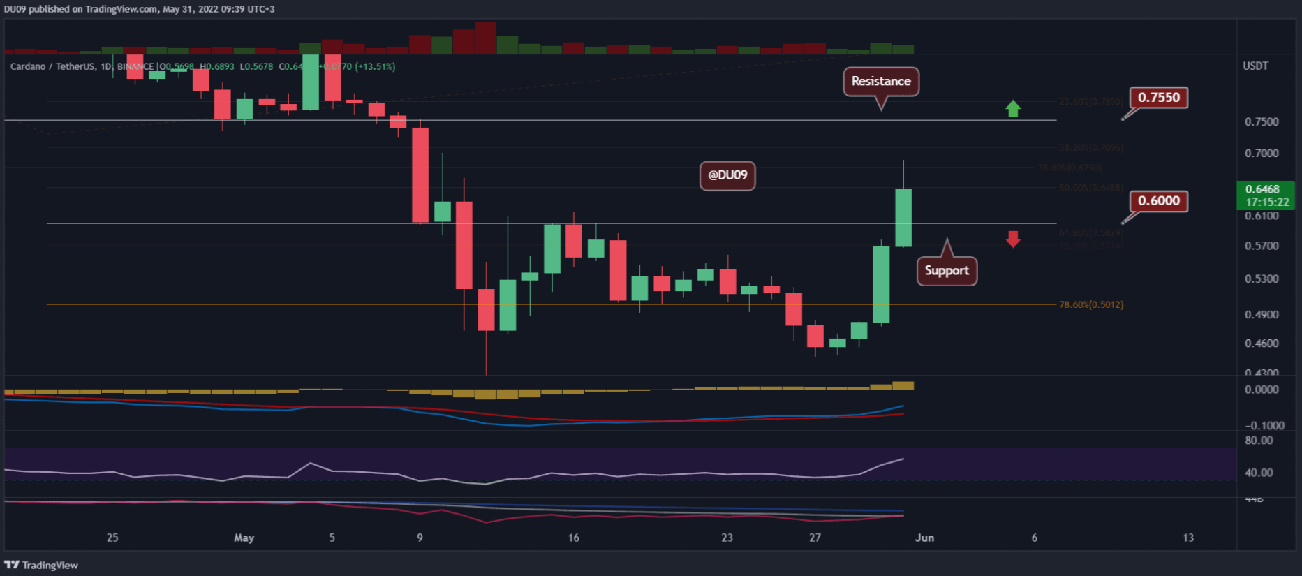 Vào ngày 28 tháng 5, ADA đã tìm thấy mức đáy cục bộ mới ở khoảng $ 0,45 và kể từ đó, nó chỉ tăng lên. Giá đã bứt phá lên trên một số mức kháng cự quan trọng và di chuyển đến gần $ 0,66 tại thời điểm viết bài. Mức kháng cự hiện tại được tìm thấy ở $ 0,75 và mức hỗ trợ ở $ 0,60.