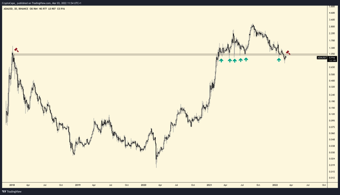 Bắt đầu với nền tảng hợp đồng thông minh Cardano, trader Capo nói rằng tiền điện tử lớn thứ 9 tính theo vốn hóa thị trường đang ở trong lãnh thổ “cực kỳ giảm giá” sau khi chuyển đổi vùng hỗ trợ quanh mức giá 1,05 đô la thành kháng cự.