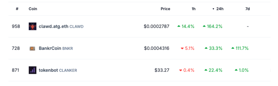 Diễn biến tích cực cũng ghi nhận ở một số token AI khác, khi BNKR tăng mạnh trong 24 giờ qua. Theo dữ liệu CoinGecko, nhóm token AI nằm trong số những tài sản có hiệu suất tăng trưởng nổi bật nhất thị trường.