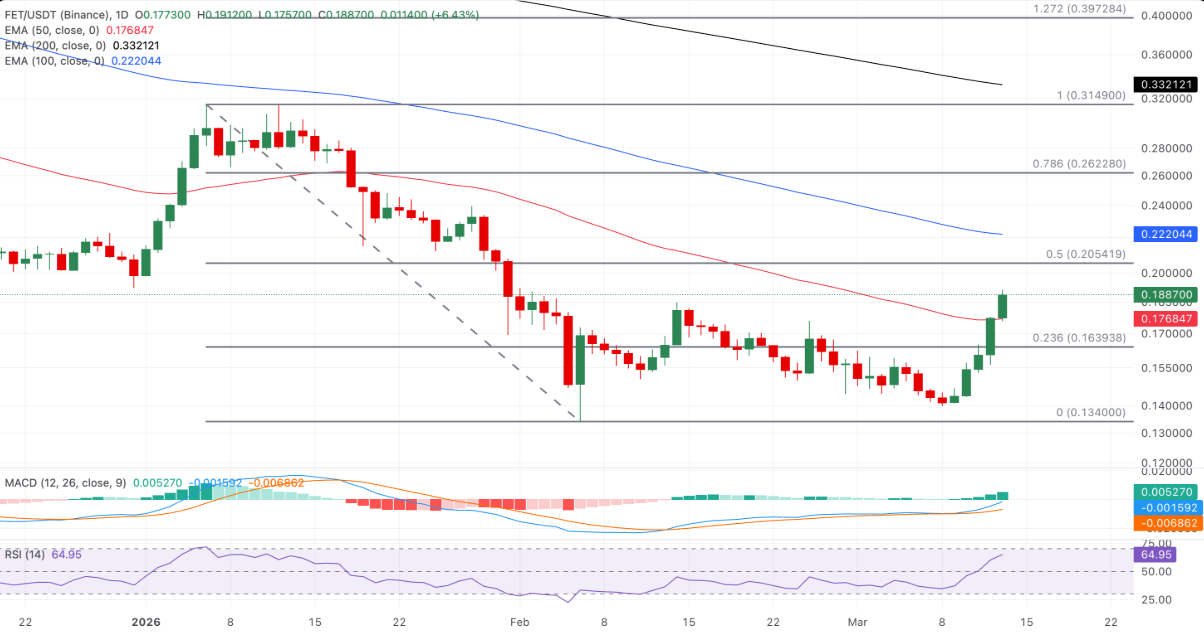 FET tăng khoảng 6% vào thời điểm viết bài trong phiên thứ Sáu, nâng tổng mức tăng của cả tuần lên gần 35%. Đà phục hồi giúp xu hướng ngắn hạn chuyển sang tích cực khi giá bật lên từ vùng đáy gần đây quanh 0,1400 USD và vượt qua đường trung bình động hàm mũ (EMA) 50 ngày tại 0,1768 USD – một tín hiệu cho thấy lực mua đang dần chiếm ưu thế trên thị trường.
