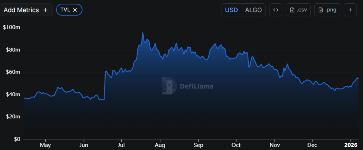 Theo dữ liệu từ DefiLlama, tổng giá trị bị khóa (TVL) của Algorand đã duy trì đà tăng ổn định kể từ giữa tháng 12, hiện đạt xấp xỉ 54,7 triệu USD. Diễn biến này cho thấy dòng vốn đang quay trở lại hệ sinh thái Algorand, phản ánh mức độ quan tâm ngày càng lớn của người dùng khi họ tích cực gửi và triển khai tài sản trên các giao thức xây dựng trên nền tảng ALGO.
