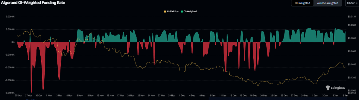 Ở thị trường phái sinh, các chỉ báo cũng nghiêng về kịch bản tăng giá. Funding rate của Algorand tiếp tục duy trì xu hướng tích cực, với dữ liệu OI-Weighted Funding Rate từ Coinglass cho thấy số lượng trader đặt cược vào chiều tăng đang vượt trội so với nhóm kỳ vọng giá giảm. Đáng chú ý, chỉ số này đã chuyển sang vùng dương từ đầu tuần và tăng lên 0,0084% vào thứ Năm, cho thấy phe Long sẵn sàng trả phí để duy trì vị thế. Trong quá khứ, những lần funding rate đảo chiều từ âm sang dương và tiếp tục mở rộng thường đi kèm với các đợt tăng giá đáng kể của Algorand.