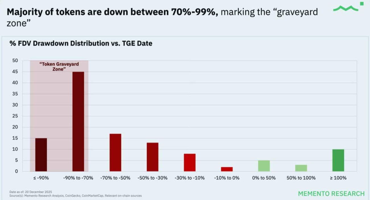 Thực tế cho thấy, đa số token hiện đã trượt sâu vào khu vực được ví như “vùng nghĩa địa” (graveyard zone). Xét trên phương diện kỹ thuật, khoảng 60% số token đã mất từ 70% đến 99% giá trị so với các đỉnh gần nhất trên biểu đồ.