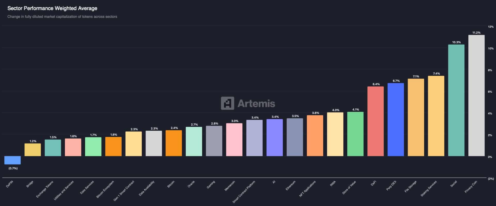 Thống kê trong bảy ngày gần nhất cho thấy các narrative dẫn dắt thị trường gồm quyền riêng tư (privacy), token xã hội (social tokens) và các dịch vụ staking. Ba nhóm này ghi nhận mức tăng trung bình có trọng số lần lượt đạt 11,1%, 10,2% và 7,1%, vượt trội so với phần lớn các phân khúc altcoin khác.