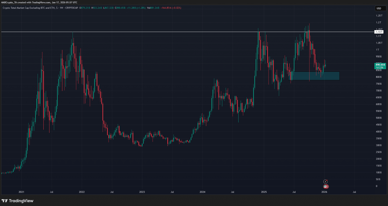 Thị trường altcoin đang trong giai đoạn tích lũy, từng bước gom đủ động lực cho một chu kỳ tăng mới. Điều này được thể hiện rõ ngay trong tuần đầu tiên của năm, khi Bitcoin (BTC) bật tăng mạnh từ 87.500 USD lên 94.800 USD. Song song đó, tỷ lệ thống trị của BTC (BTC.D) lại suy giảm từ 59,58% xuống 58,7%, cho thấy dòng tiền bắt đầu có dấu hiệu dịch chuyển. Đáng chú ý, vốn hóa thị trường altcoin (không bao gồm Ethereum) đã tăng thêm 82,56 tỷ USD, tương đương mức tăng gần 10%.