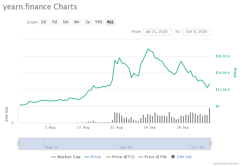 YFI là một trong những token hoạt động tốt nhất trong bối cảnh bong bóng DeFi, YFI tăng hơn 900% chỉ trong tháng 8, đạt mức cao nhất mọi thời đại là hơn 43.500 đô la bốn tuần trước. YFI đang tăng gần 20% trong 24h qua.