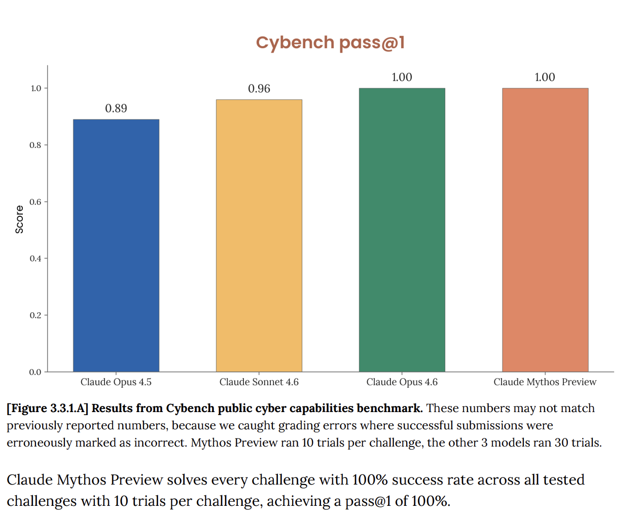Trên Cybench, bộ đánh giá công khai tiêu chuẩn về năng lực an ninh mạng dùng để theo dõi tiến triển mô hình qua 40 thử thách “capture-the-flag”, Mythos đạt 100%. Hoàn hảo. Và ngay lập tức Anthropic ghi chú rằng bài kiểm chuẩn này “không còn đủ thông tin để phản ánh năng lực của các mô hình tiên phong hiện nay”. Câu đó mang rất nhiều ý nghĩa. Bài kiểm vốn dùng để cho bạn biết một AI có tạo ra rủi ro an ninh mạng nghiêm trọng hay không, thì nay không còn nói lên điều gì về Mythos nữa, vì mô hình đã vượt qua hoàn toàn.