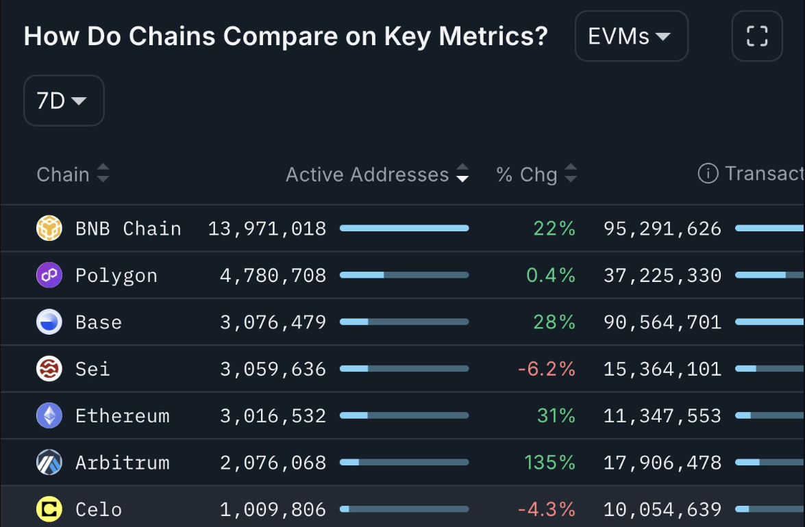 Arbitrum vừa ghi dấu ấn là blockchain EVM tăng trưởng mạnh nhất trong tuần qua, với số lượng địa chỉ hoạt động vượt mốc 2 triệu, tăng vọt 135% so với tuần trước, theo dữ liệu từ Nansen. Dù vậy, BNB Chain vẫn giữ vị trí dẫn đầu toàn thị trường với gần 14 triệu địa chỉ hoạt động, theo sau là Polygon và Base, lần lượt ghi nhận 4,7 triệu và 3 triệu địa chỉ.
