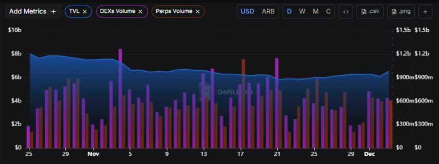 Tổng giá trị bị khóa (TVL) trên chuỗi vẫn duy trì trạng thái ổn định kể từ đầu tháng 12. Tuy vậy, số liệu cập nhật trong tháng cho thấy TVL đã tăng thêm 7%, nâng tổng giá trị lên khoảng 6,53 tỷ USD.