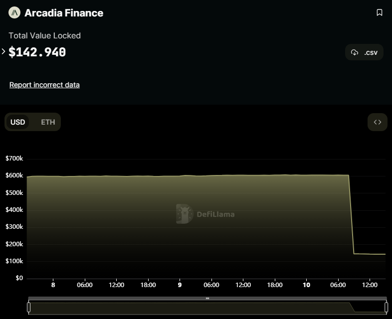Ngoài ra, DeFiLlama đã báo cáo sự sụt giảm mạnh trong TVL của Arcadia Finance vài giờ trước. Nó đã giảm 76% từ 605.000 đô la xuống còn 142.948 đô la vào thời điểm viết bài.