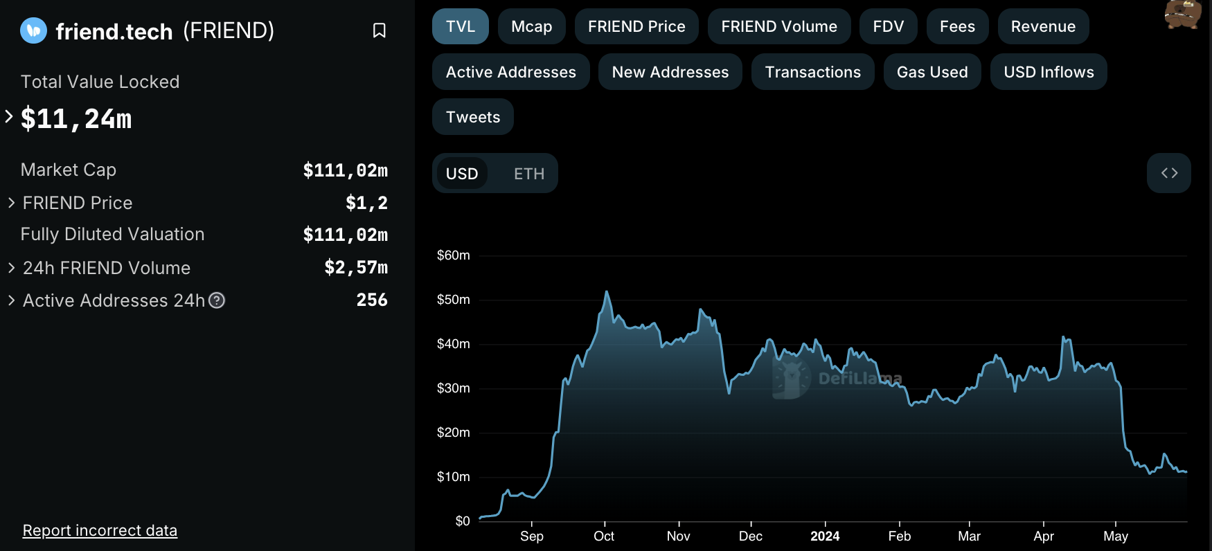 Theo CoinGecko, kể từ khi FRIEND ra mắt vào đầu tháng 5, tiền điện tử này vẫn chưa phục hồi lại mức giá ban đầu là 3,03 đô la. Thay vào đó, giá giảm gần 40% trong hai tuần qua – hiện dao động quanh mức 1 đô la.