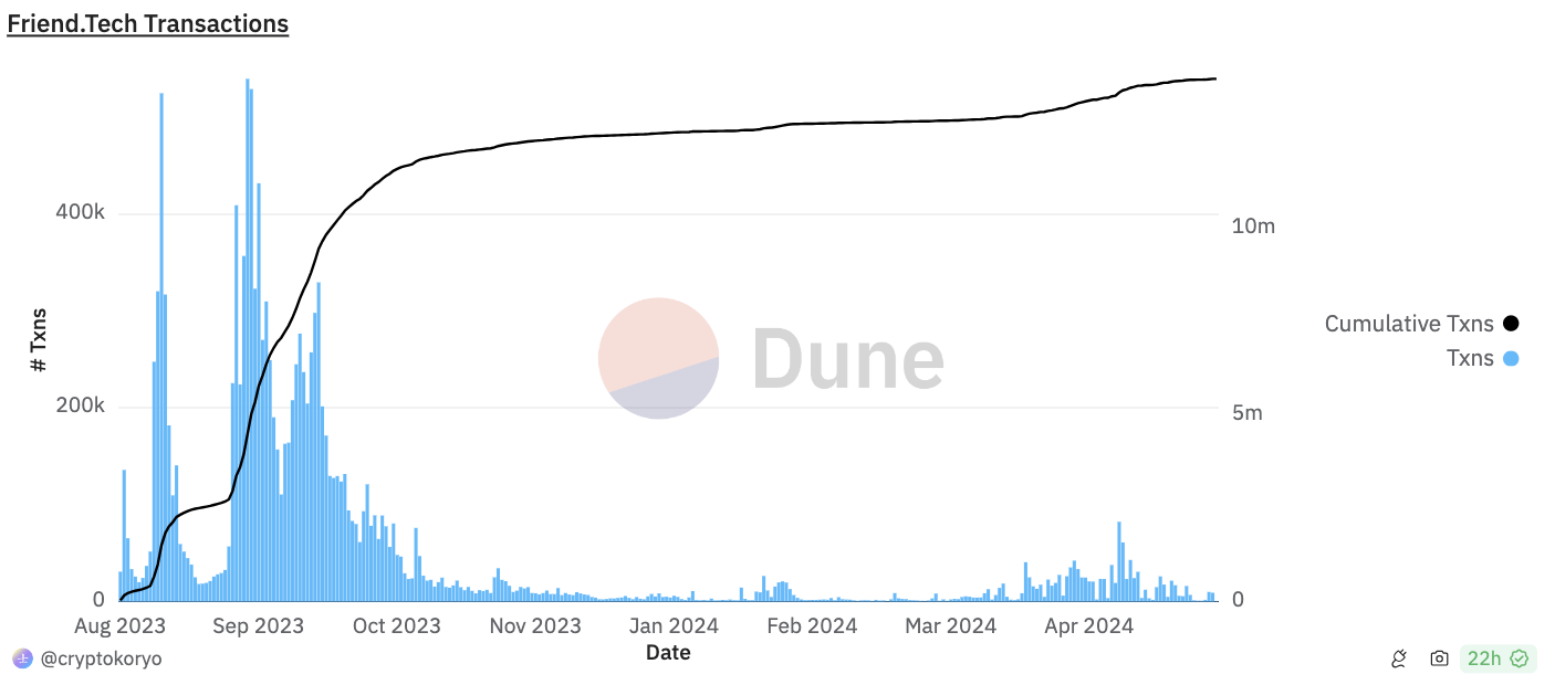 Ra mắt trên mạng layer 2 Base vào mùa hè năm ngoái, số lượng giao dịch hàng ngày trên Friend.tech bùng nổ khi ngày càng phổ biến — đạt mốc 500.000 vào tháng 9. Tuy nhiên, khi sự chú ý dành cho Friend.tech hạ nhiệt, các giao dịch hàng ngày trên giao thức này chỉ đạt trên 60.000 trong hai lần tính đến thời điểm hiện tại trong năm nay.