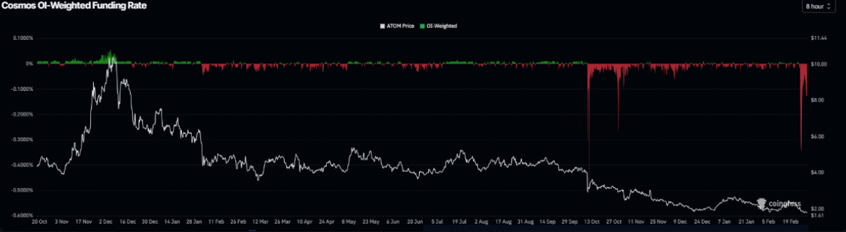 Bức tranh ảm đạm càng được củng cố khi nhìn sang dữ liệu phái sinh của Cosmos Hub. Theo chỉ báo OI-Weighted Funding Rate từ Coinglass, số lượng trader đặt cược vào kịch bản giá ATOM tiếp tục giảm hiện đang chiếm ưu thế so với phe kỳ vọng giá tăng. Chỉ báo này đã rơi xuống vùng âm từ thứ Năm và ghi nhận mức -0,127% vào thứ Hai, cho thấy các vị thế bán (short) đang phải trả phí cho vị thế mua (long) — một dấu hiệu điển hình phản ánh tâm lý bi quan đang bao trùm thị trường ATOM.