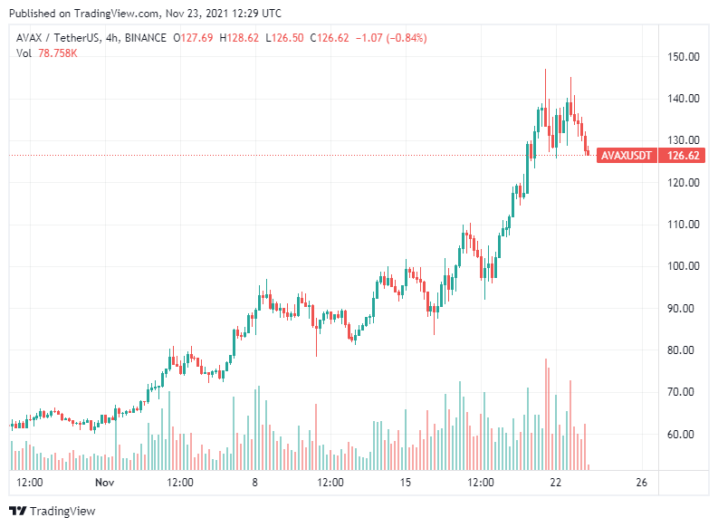 Sau khi tăng 120% trong tháng 11, cuối cùng AVAX đã có thể bước chân vào top 10 coin hàng đầu theo vốn hóa thị trường, với tổng vốn hóa trên 29 tỷ đô la. Sau khi tăng 42% trong tuần lên mức ATH mới $146 và đá DOGE ra khỏi top 10, hiện tại AVAX đang đảo chiều giảm theo xu hướng chung của thị trường rộng lớn hơn.