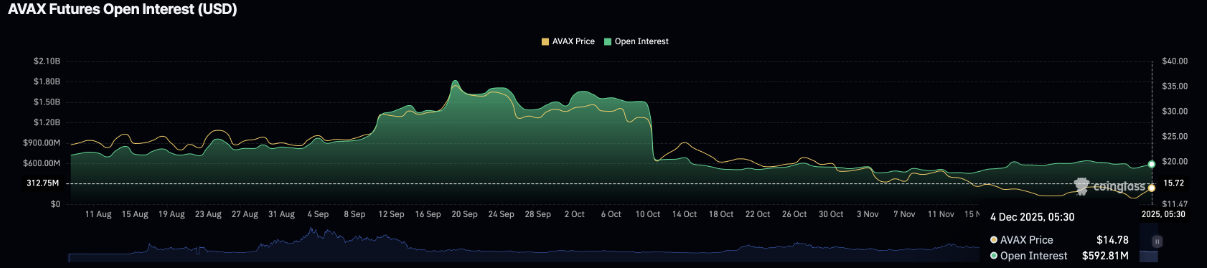 Avalanche vẫn đang vật lộn để lấy lại sự chú ý từ các nhà đầu tư cá nhân sau cú giảm mạnh vào ngày 10/10, khi hợp đồng mở (OI) hợp đồng tương lai AVAX lao dốc từ 1,45 tỷ USD xuống còn 645,54 triệu USD. Tính đến thời điểm hiện tại, OI AVAX đạt 592,81 triệu USD, tăng nhẹ so với mức 562,17 triệu USD của ngày trước đó, cho thấy nhà đầu tư vẫn giữ thái độ thận trọng, chủ yếu “quan sát và chờ đợi”.