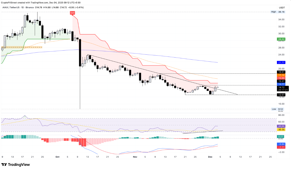 Ngược lại, nếu AVAX không thể vượt qua ngưỡng 14,77 USD, giá có nguy cơ quay trở lại mức đáy ngày 21/11 tại 12,57 USD.