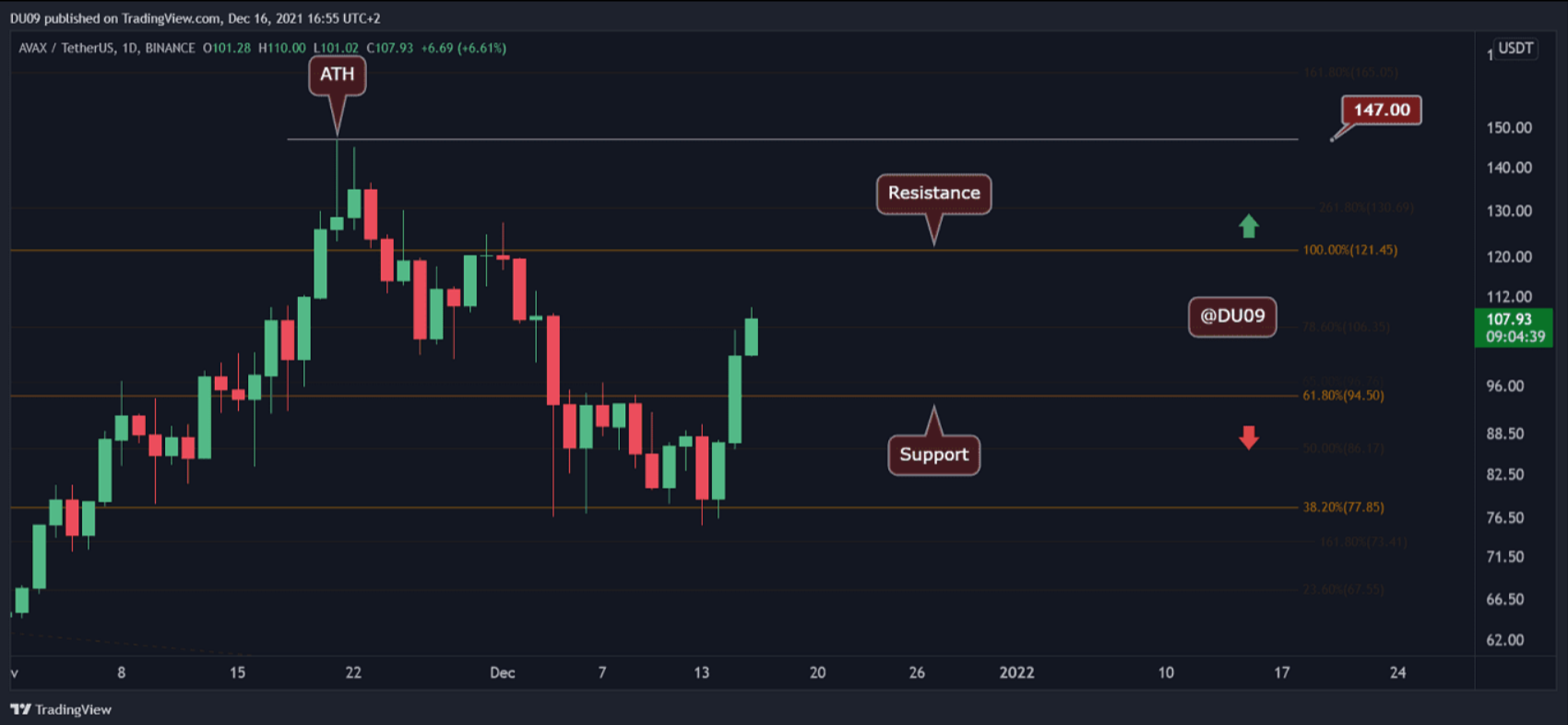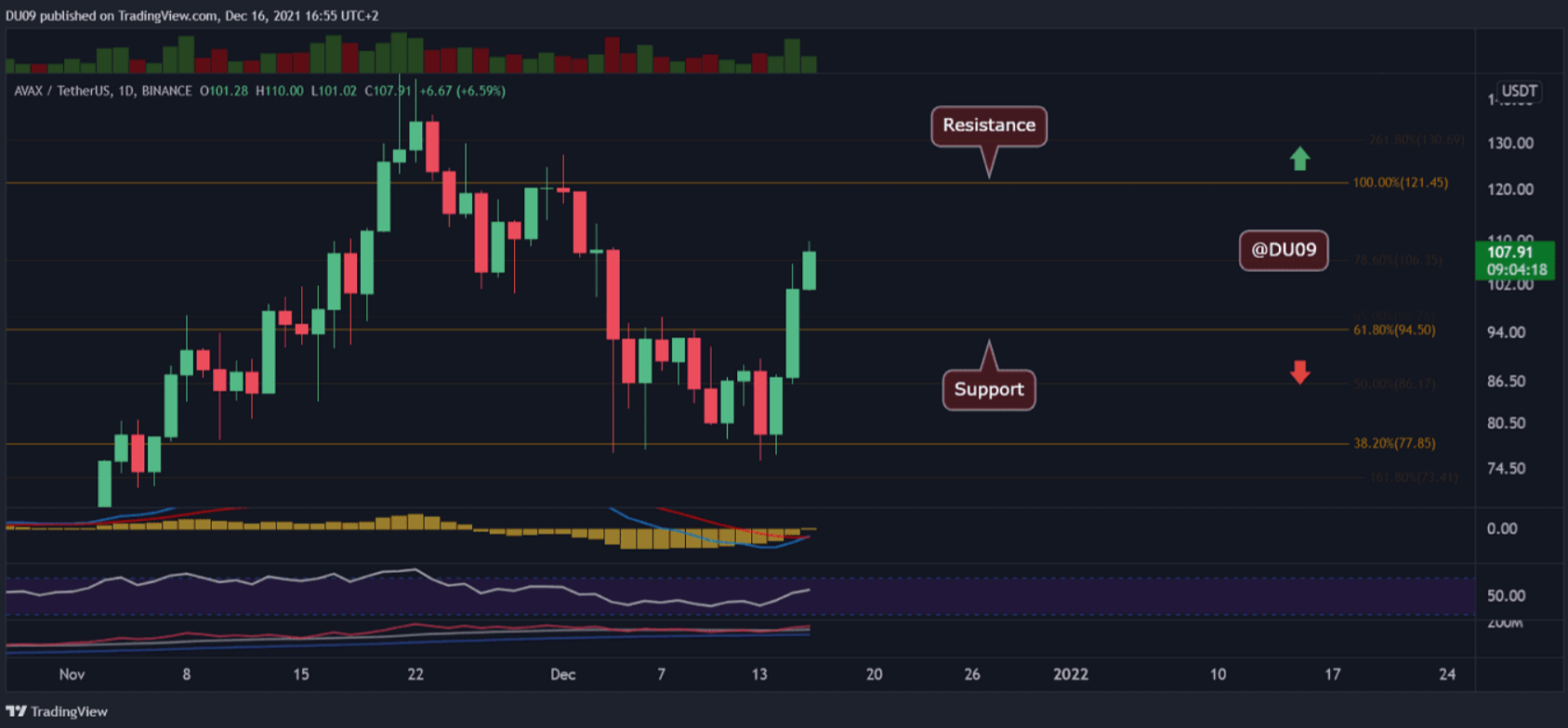 AVAX đã chạm mức hỗ trợ ở $ 78 trước khi bắt đầu một đợt tăng giá đáng kể sau khi Circle công bố USDC hiện đã có thể giao dịch trên blockchain AVAX. Tin tức này đã đưa tiền điện tử lên trên ngưỡng kháng cự $ 100, hiện đóng vai trò là hỗ trợ. Mức kháng cự quan trọng tiếp theo được tìm thấy ở $ 121 và mức cao nhất mọi thời đại vẫn còn cách xa ở $ 147.