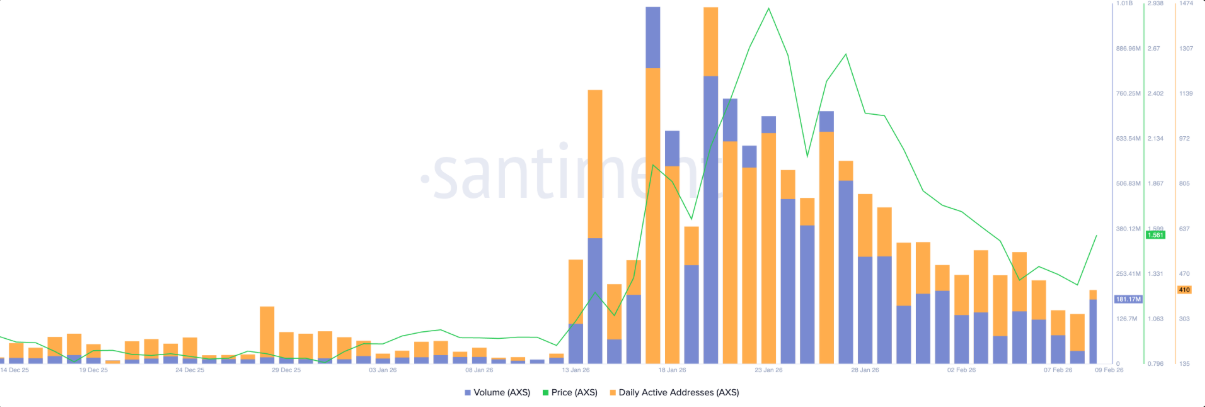 Đáng chú ý, khối lượng giao dịch trong ngày thứ Ba vọt lên hơn 181 triệu AXS, vượt xa mức 36,67 triệu AXS của ngày trước đó. Thông thường, sự bùng nổ về thanh khoản đi kèm với nhịp hồi phục giá sẽ nâng cao khả năng kéo dài đà tăng trong ngắn hạn.