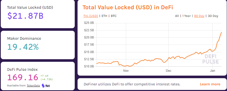 Dữ liệu ngành cũng cho thấy sự gia tăng đáng kể về tổng giá trị bị khóa trong các dự án DeFi. Theo Defi Pulse, gần 21,87 tỷ đô la đã bị khóa vào hệ sinh thái, mức cao nhất mọi thời đại.