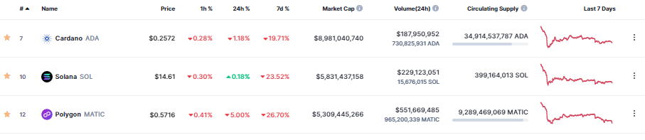 Tại thời điểm viết bài, MATIC đang sụt giảm — mất khoảng 5% — tuy nhiên, SOL đang tăng nhẹ 0,7% và Cardano đang giảm nhẹ 0,5%. Các token nằm trong số 20 loại tiền điện tử có giá trị nhất theo giới hạn thị trường.