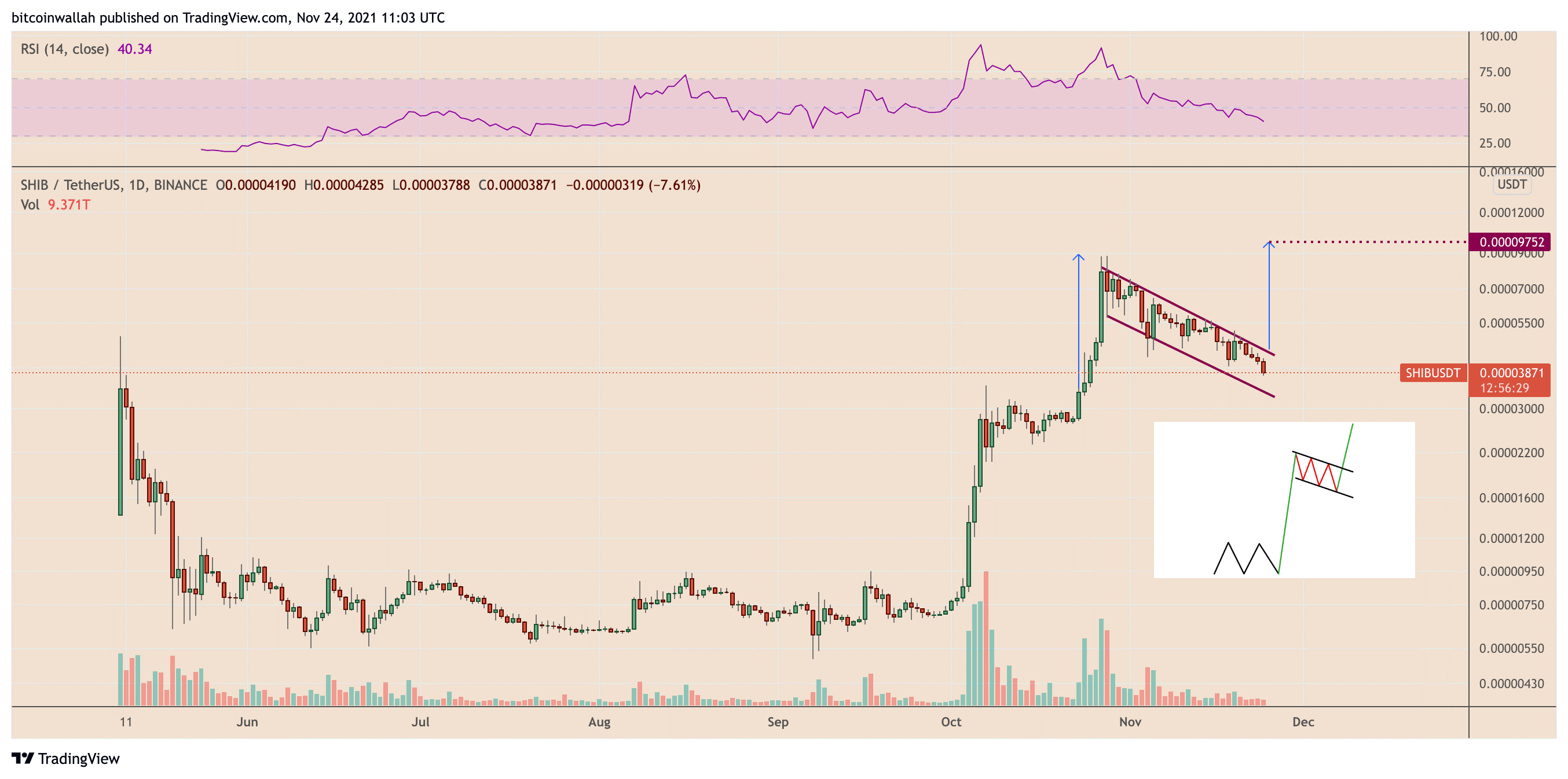 Biểu đồ giá SHIB/USDT hàng ngày và thiết lập cờ bò | Nguồn: TradingView