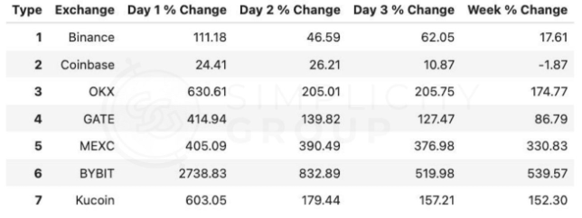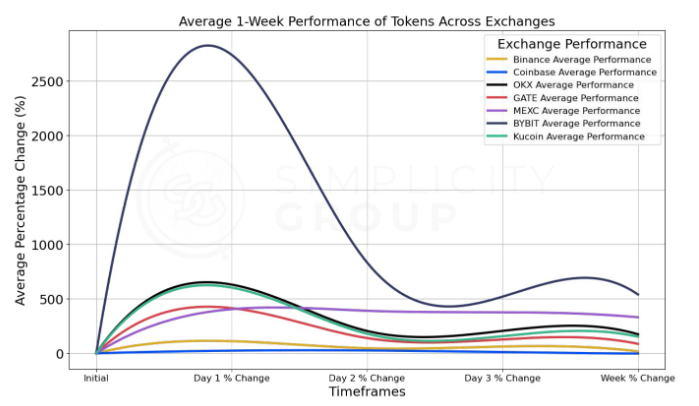 Theo dữ liệu được tổng hợp bởi Simplicity Group Research, báo cáo đã so sánh tỷ lệ phần trăm thay đổi giá token trung bình của các sàn giao dịch lớn như Binance, Coinbase, OKX, Gate.io, MEXC, Bybit và KuCoin sau khi niêm yết.
