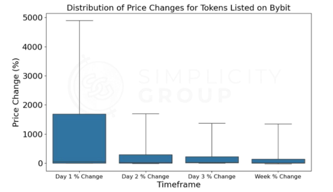 Biểu đồ mô tả sự phân bổ thay đổi giá của các token được niêm yết trên Bybit. Nguồn: Báo cáo của Simplicity Group Research