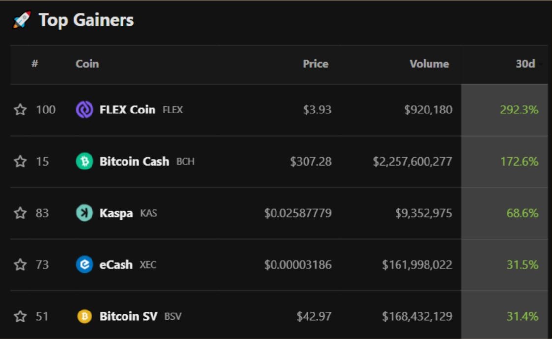 Trong số những coin kiếm được nhiều lợi nhuận nhất vào tháng 6, ba fork Bitcoin đã lọt vào danh sách, tiếp theo là Kaspa và FLEX Coin (FLEX). FLEX được hưởng lợi từ việc tích hợp với Open Exchange (OPNX), do các đồng sáng lập quỹ Three Arrows Capital đã phá sản ra mắt.