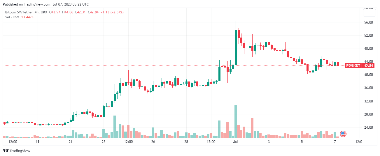 BSV có xu hướng giảm nhất quán kể từ năm 2022, do sự quan tâm đến blockchain này giảm dần sau hậu thị trường bò và khối lượng giao dịch cạn kiệt.