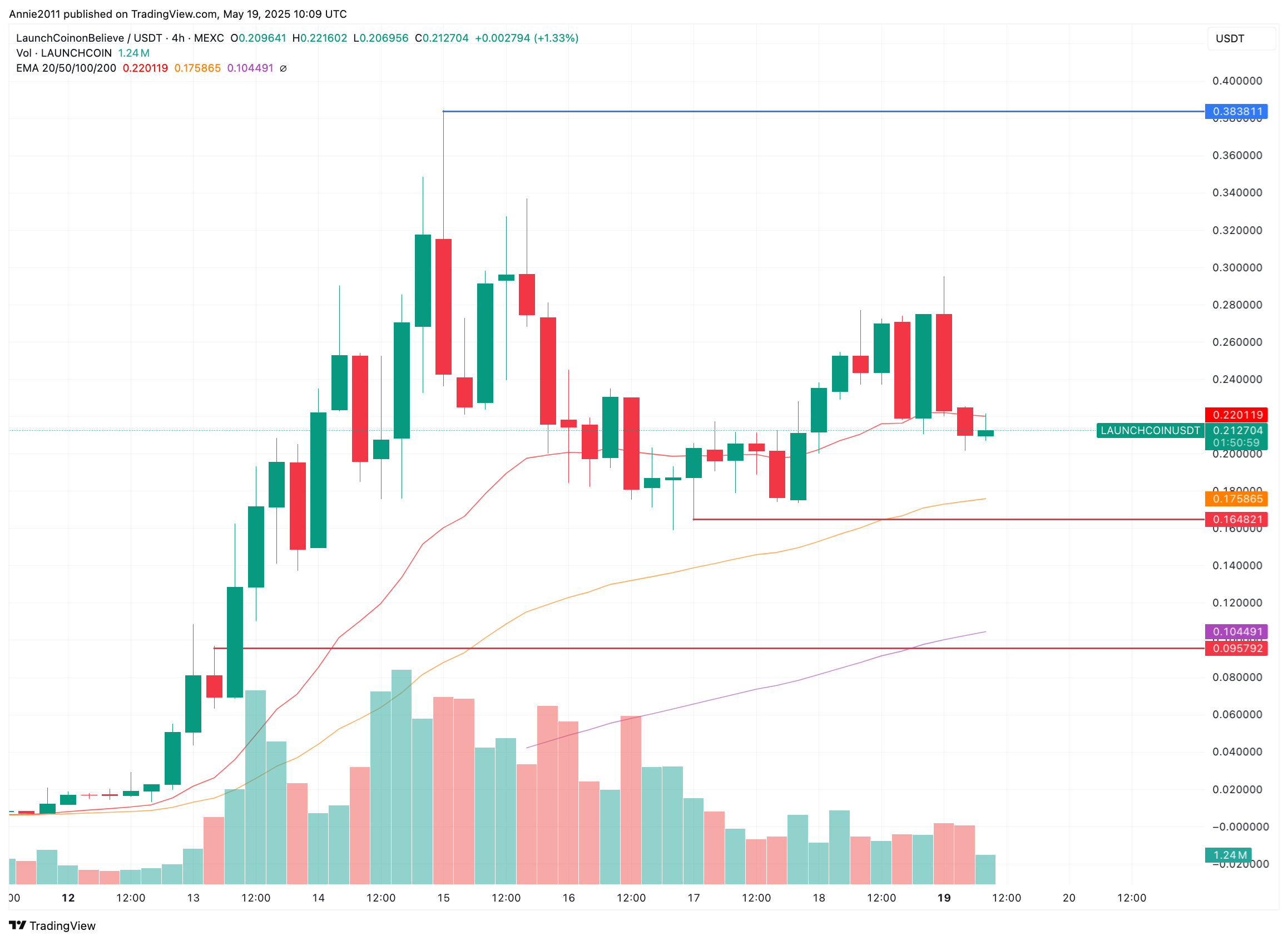 Mức hỗ trợ quan trọng đầu tiên nằm tại 0,16 USD – vùng giá từng đóng vai trò là đỉnh cũ trước khi bị phá vỡ. Nếu mốc này không được giữ vững, LAUNCHCOIN có thể rơi sâu hơn về vùng 0,095 USD, tương đương với mức thoái lui khoảng 60% kể từ đỉnh – một kịch bản không hiếm trong thế giới memecoin khi làn sóng hưng phấn đi qua.