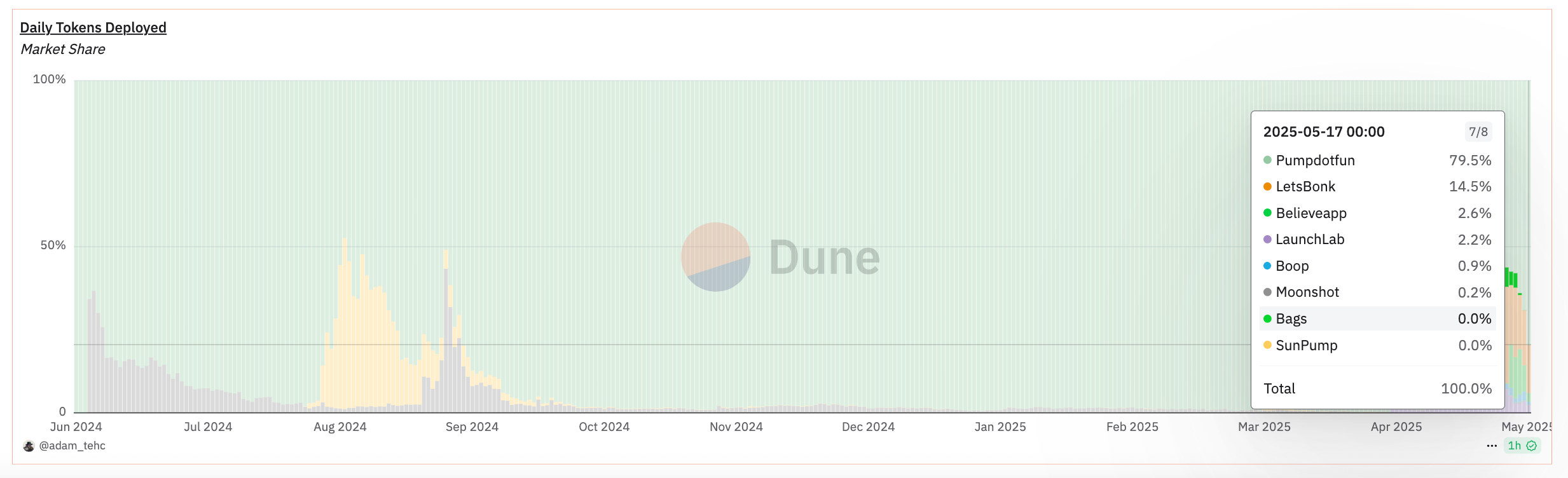 Về thị phần, Believe từng đạt đỉnh vào ngày 15/5 khi chiếm tới 13,6% tổng số token được ra mắt trên Solana, một thành tích ấn tượng trong giai đoạn ngắn. Thế nhưng, chỉ hai ngày sau, con số này đã giảm mạnh xuống còn 2,6%, cho thấy áp lực duy trì tăng trưởng đang là thách thức thực sự với nền tảng non trẻ này.