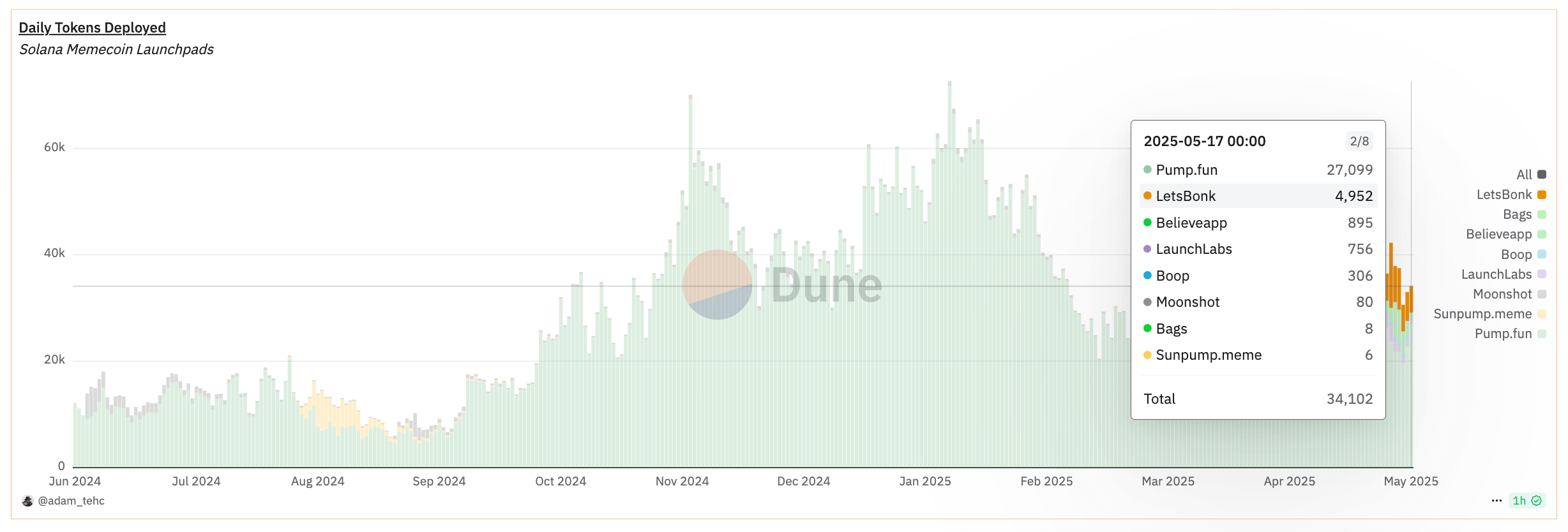 Tuy nhiên, làn sóng hưng phấn ban đầu đã không duy trì được lâu. Chỉ trong hai ngày tiếp theo, số lượng token ra mắt qua Believe giảm xuống còn 2.600 token vào ngày 16/5 và chỉ còn 895 token vào ngày 17/5. Mức suy giảm này cho thấy sự cường điệu ban đầu xung quanh nền tảng có thể đang tạm thời hạ nhiệt – một hiện tượng thường thấy với các sản phẩm mới thu hút từ hiệu ứng FOMO (sợ bỏ lỡ).
