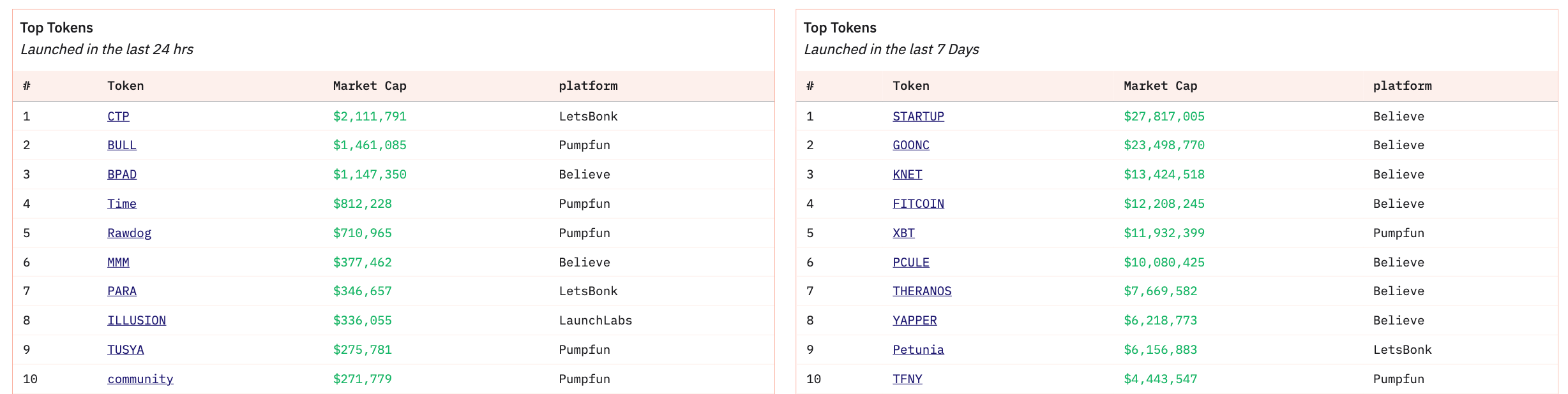 Dẫu vậy, vẫn có những điểm sáng giữa thời kỳ điều chỉnh. 7 trong số các token hoạt động tốt nhất được ra mắt trên Solana trong vòng 7 ngày qua có nguồn gốc từ Believe. Tuy nhiên, tính riêng trong 24 giờ gần nhất, chỉ 2 token từ Believe lọt vào top, cho thấy tính biến động cao và sự cạnh tranh khốc liệt trong không gian memecoin.