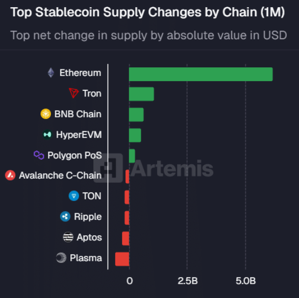 Dữ liệu trên nhiều khung thời gian cho thấy Ethereum đang bỏ xa các mạng layer-1 khác về quy mô stablecoin. Chỉ trong một tháng, mạng lưới này đã bổ sung thêm 7 tỷ USD vào các pool stablecoin, đồng thời dẫn đầu dòng tiền 24 giờ với 2,3 tỷ USD chảy vào. Những con số này phản ánh rõ đà tăng tốc mạnh mẽ của Ethereum trong việc mở rộng dòng chảy DeFi.