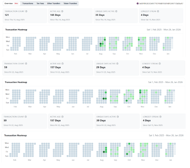 Quan trọng hơn, các biểu đồ nhiệt giao dịch cho thấy các ví này mua LINK với khối lượng tương tự nhau vào đúng cùng những ngày. Dù có khác biệt nhỏ ở giai đoạn đầu, sau đó toàn bộ ví đều tuân theo cùng một nhịp tích lũy hàng tháng — dấu hiệu mạnh cho thấy chúng thuộc quyền kiểm soát của cùng một thực thể.