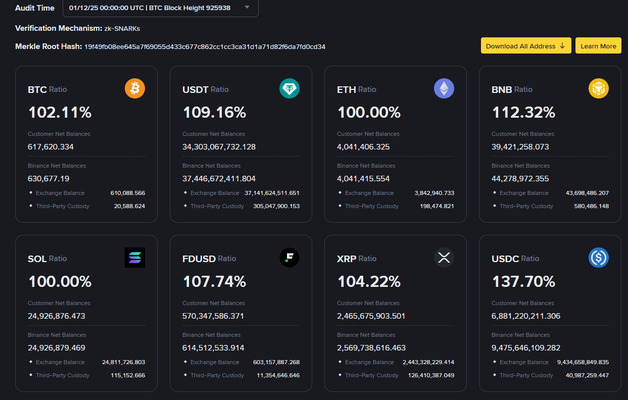 Dữ liệu cũng ghi nhận sự sụt giảm nhẹ trong số dư USDT của người dùng, giảm 1,24% xuống còn 34,3 tỷ USDT, tương đương giảm khoảng 430 triệu USDT. Tổng thể, bản báo cáo phản ánh sự thay đổi trong hành vi và chiến lược của nhà đầu tư khi điều chỉnh danh mục vào tháng cuối năm. Việc Binance liên tục công bố dữ liệu dự trữ thể hiện cam kết minh bạch và duy trì sự tin cậy trong hệ sinh thái tài sản số.