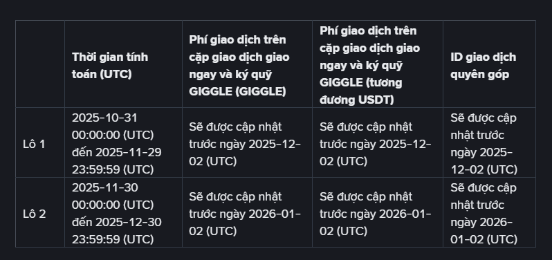 Từ tháng 12 năm 2025, Binance sẽ quyên góp 50% phí giao dịch từ Spot và Margin của Giggle Fund (GIGGLE) để hỗ trợ các dự án từ thiện do Giggle Fund khởi xướng. Giggle Fund là một memecoin hướng đến từ thiện trên BNB Smart Chain, nhằm chuyển đổi hoạt động giao dịch thành các khoản đóng góp cho giáo dục trẻ em thông qua Giggle Academy. Sáng kiến này giúp người dùng vừa giao dịch vừa góp phần tạo tác động xã hội tích cực thông qua công nghệ blockchain.