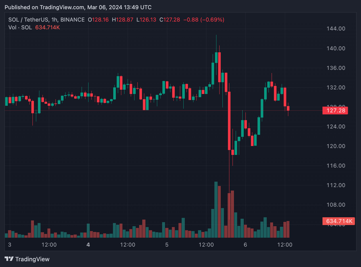 Token gốc SOL của Solana đã giảm gần 5% trong 24 giờ và đang giao dịch ở mức 127 USD.
