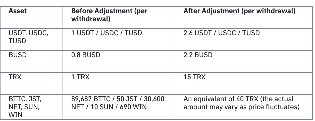 Theo trang tin AZCoin News thông báo, phí rút USDT/USDC đã tăng từ 1U lên 2,6U và phí rút BUSD đã tăng từ 0,8U lên 2,2U. Trong khi đó, phí rút TRX đã tăng từ 1TRX lên 15TRX. Ngoài ra, phí rút tiền cho BTTC, JST, NFT, SUN và WIN đã thay đổi từ 89.687 BTTC / 50 JST / 30.600 NFT / 10 SUN / 690 WIN thành tương đương 40 TRX. Điều quan trọng cần lưu ý là số tiền thực tế có thể dao động tùy thuộc vào giá thị trường.