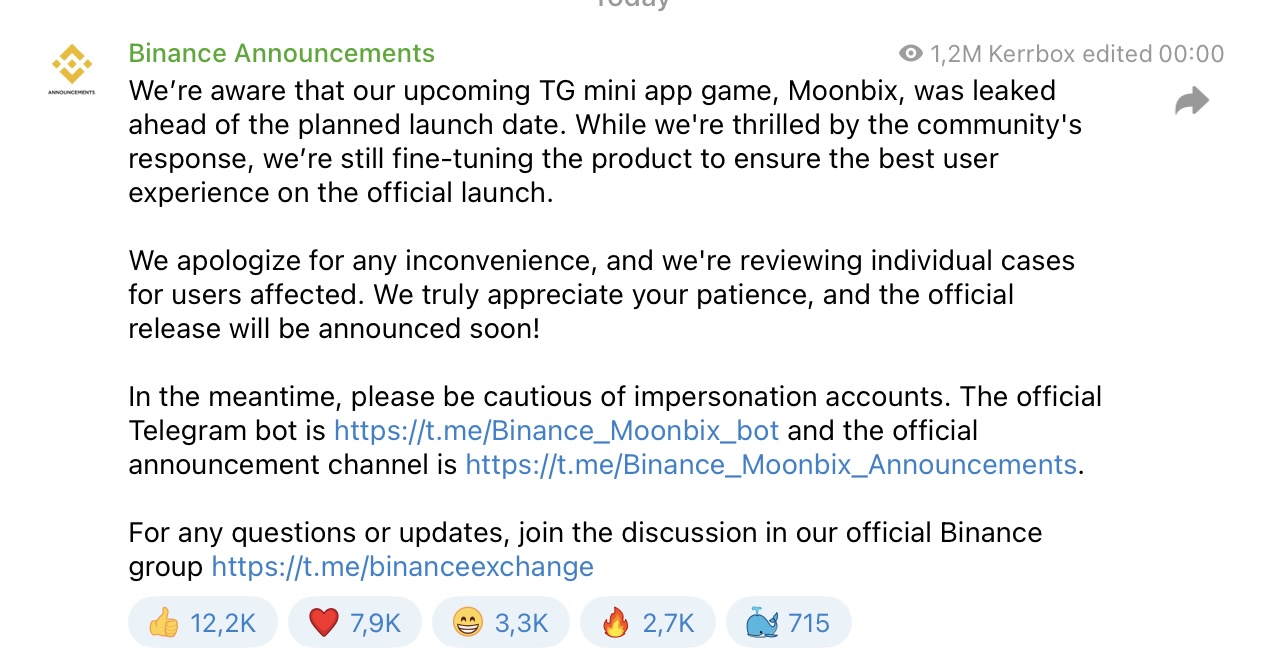Binance viết: “Chúng tôi nhận thức rằng trò chơi mini app trên Telegram sắp ra mắt của chúng tôi, Moonbix, đã bị rò rỉ trước ngày dự kiến. Dù rất hào hứng trước phản hồi tích cực từ cộng đồng, chúng tôi vẫn đang tinh chỉnh sản phẩm để đảm bảo trải nghiệm người dùng tốt nhất khi chính thức ra mắt.