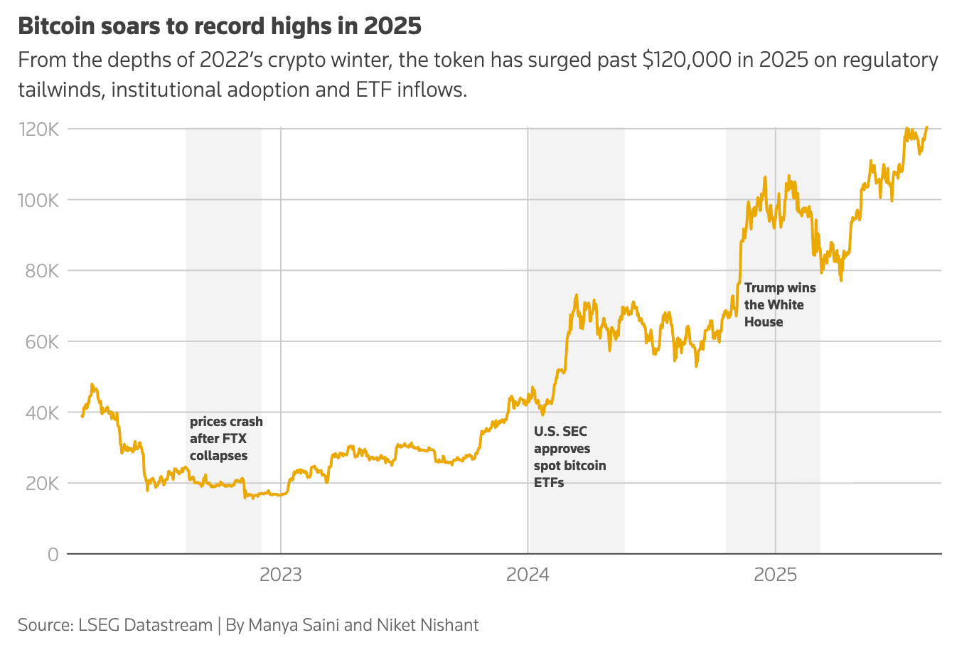 Điều trớ trêu là đỉnh chu kỳ của Bitcoin lại rơi đúng vào vùng đó. Nhiều thống kê và đồ thị theo dõi đà tăng năm 2025 cho thấy giá tập trung quanh mốc 125.000 USD.